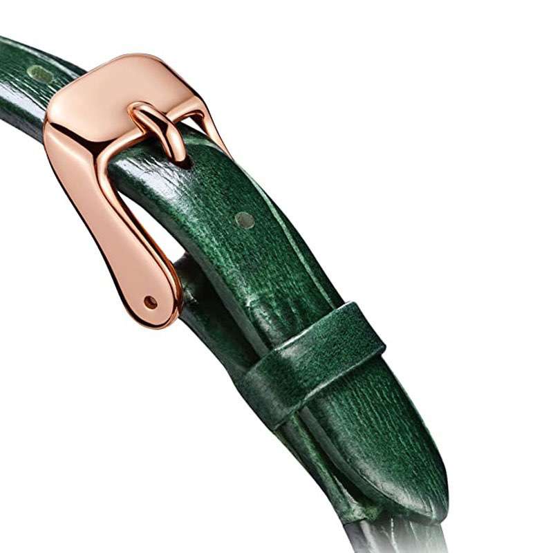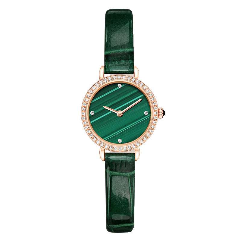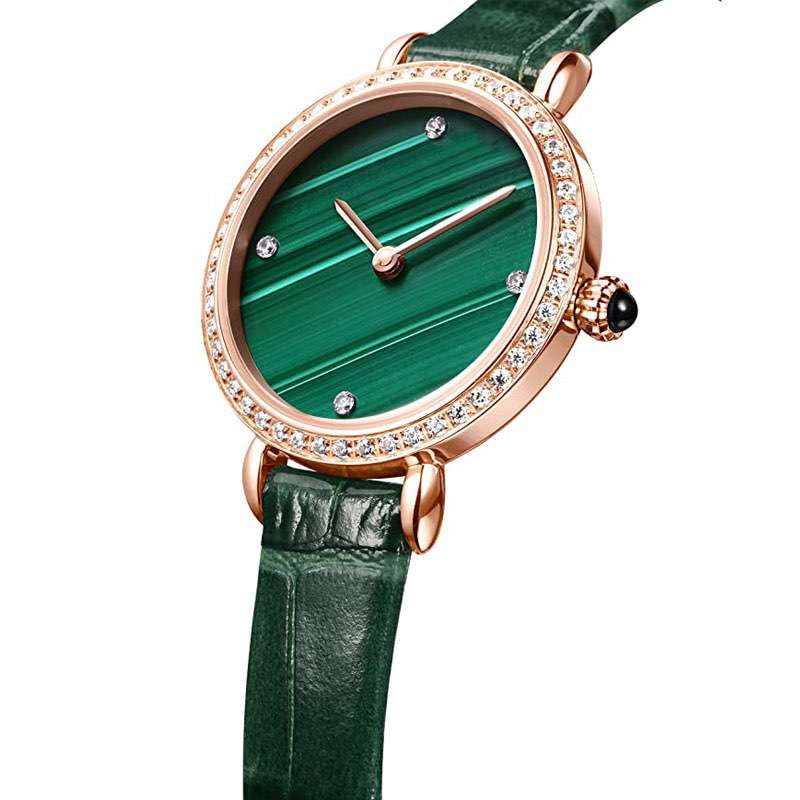 We create dials from cut gemstones, both synthetic gemstones and real gemstones. When working with stones, we design consistent color schemes to cover every element of the watch, often matching the stone’s color with band and strap colors. This allows brands to develop styles that correlate to their brand. This green gemstone diamond watch is a great example of how we help partners match straps to dial colours.