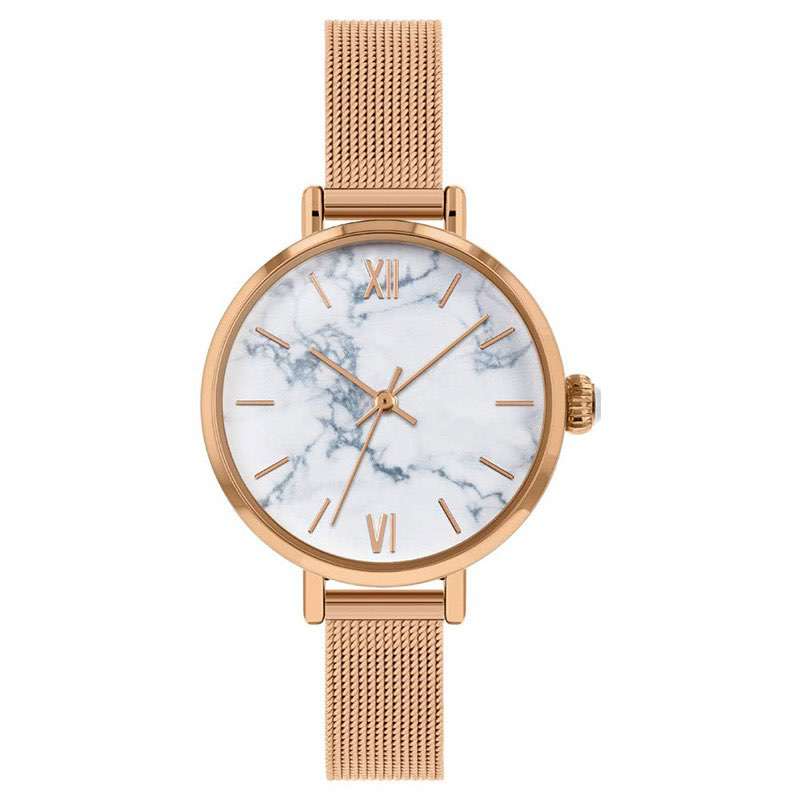 We create dials from cut gemstones, both synthetic gemstones and real gemstones. When working with stones, we design consistent color schemes to cover every element of the watch, often matching the stone’s color with band and strap colors. This allows brands to develop styles that correlate to their brand. This white marble watch OEM manufacturer is a great example of how we help partners produce completed and well-baked designs.